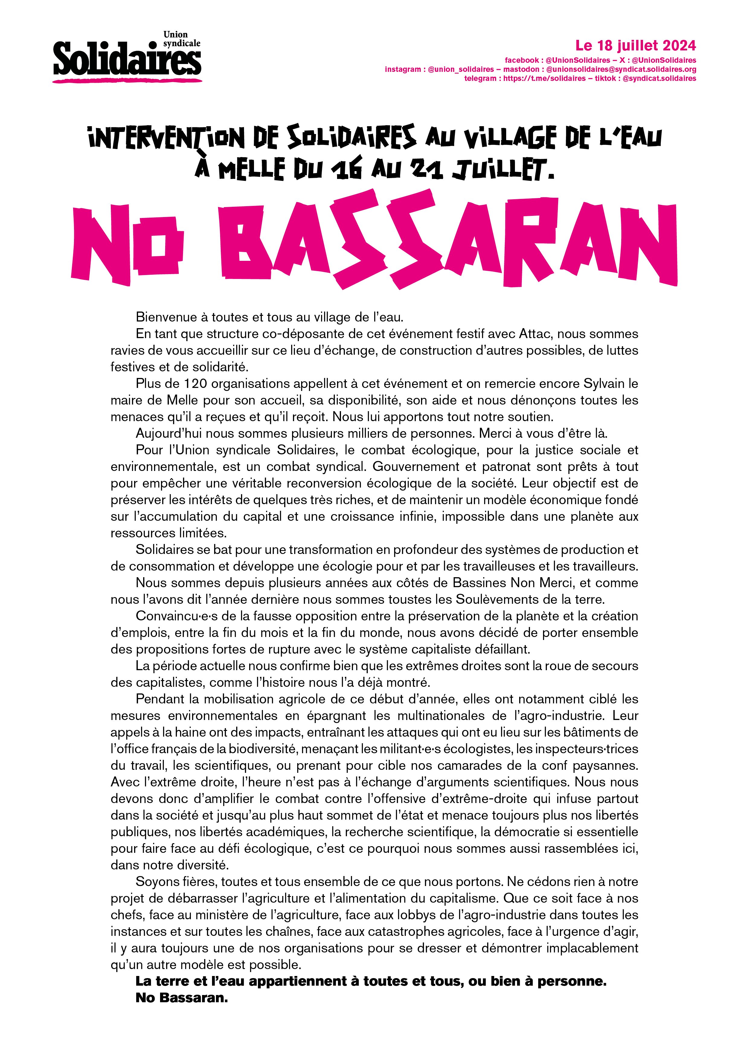 Nous sommes depuis plusieurs années aux côtés de Bassines Non Merci, et comme nous l’avons dit l’année dernière nous sommes toustes les Soulèvements de la terre.