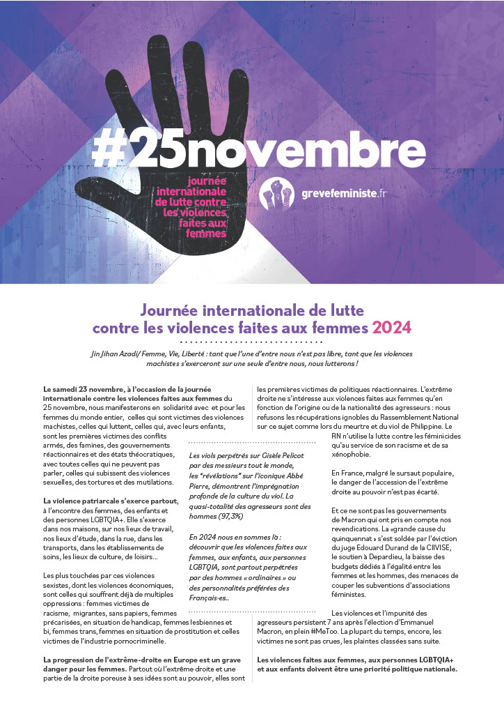 Le samedi 23 novembre, à l’occasion de la journée internationale contre les violences faites aux femmes du 25 novembre, nous manifesterons en solidarité avec et pour les femmes du monde entier, celles qui sont victimes des violences machistes, celles qui luttent, celles qui avec leurs enfants, sont les premières victimes des conflits armés, des famines, des gouvernements réactionnaires et des états théocratiques, avec toutes celles qui ne peuvent pas parler, celles qui subissent des violences sexuelles, des tortures et des mutilations.