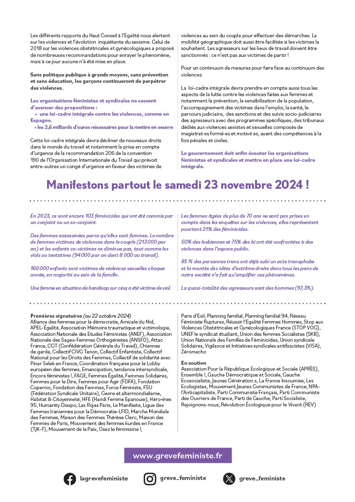En 2023, ce sont encore 103 féminicides qui ont été commis par un conjoint ou un ex-conjoint. Des femmes assassinées parce qu’elles sont femmes. Le nombre de femmes victimes de violences dans le couple (213 000 par an) et les enfants co-victimes ne diminue pas, tout comme les viols ou tentatives (94 000 par an dont 8 000 au travail). 160 000 enfants sont victimes de violences sexuelles chaque année, en majorité au sein de la famille. Une femme en situation de handicap sur cinq a été victime de viol. Les femmes âgées de plus de 70 ans ne sont pas prises en compte dans les enquêtes sur les violences, elles représentent pourtant 21% des féminicides. 50% des lesbiennes et 75% des bi ont été confrontées à des violences dans l’espace public, 85 % des personnes trans ont déjà subi un acte transphobe et la montée des idées d’extrême droite dans tous les pans de notre société n’a fait qu’amplifier ces phénomènes.