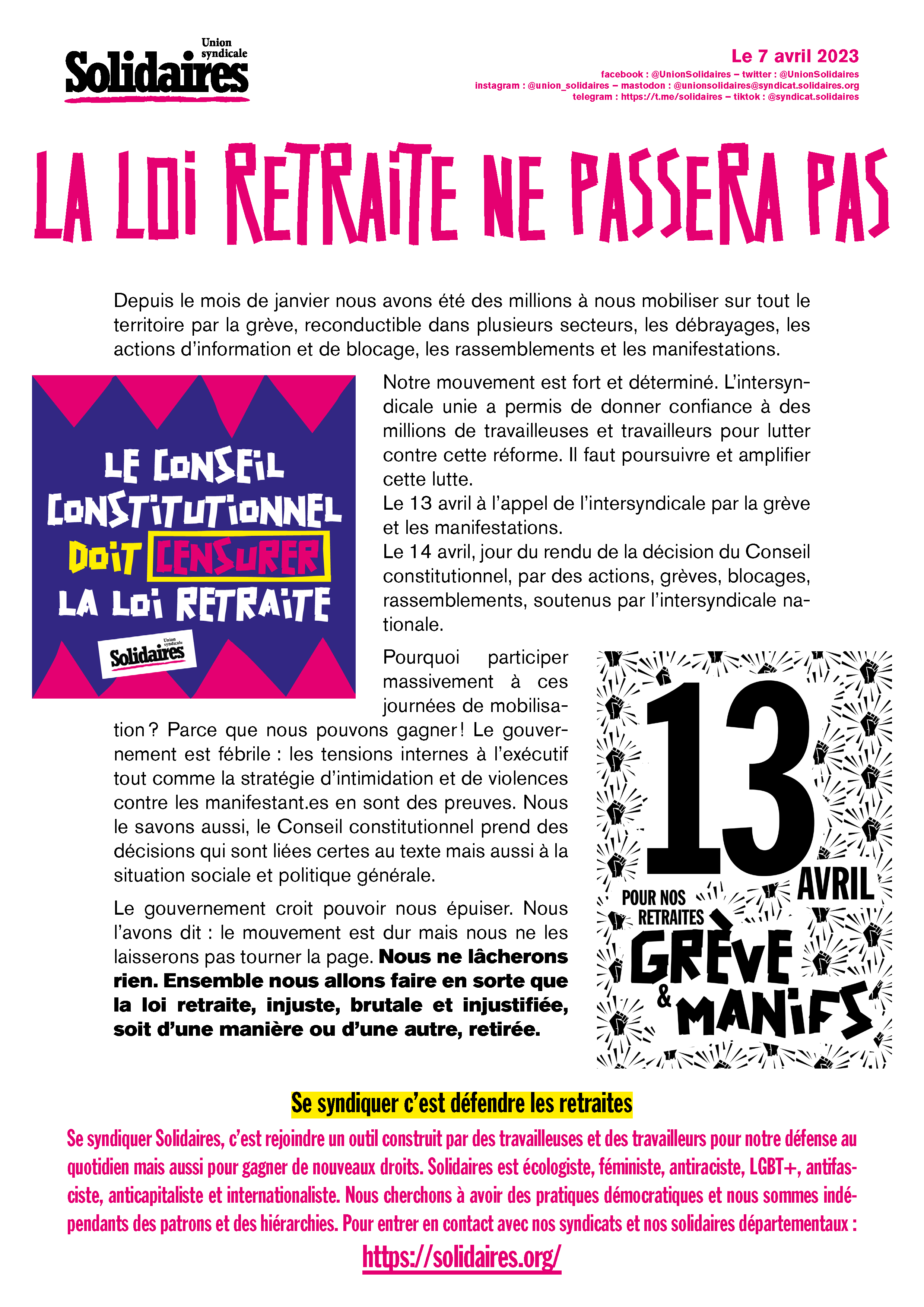 Le 14 avril, jour du rendu de la décision du conseil constitutionnel, par des actions, grèves, blocages, rassemblements, soutenus par l’intersyndicale nationale.
