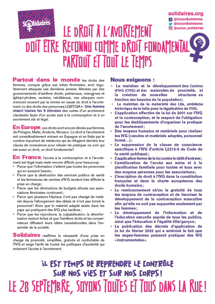 - ASSO Solidaires appelle à se mobiliser massivement à l’occasion de la Journée Internationale pour le droit à l’avortement, le 28 septembre ! TOUTES ET TOUS DANS LA RUE POUR LE DROIT à L’IVG !