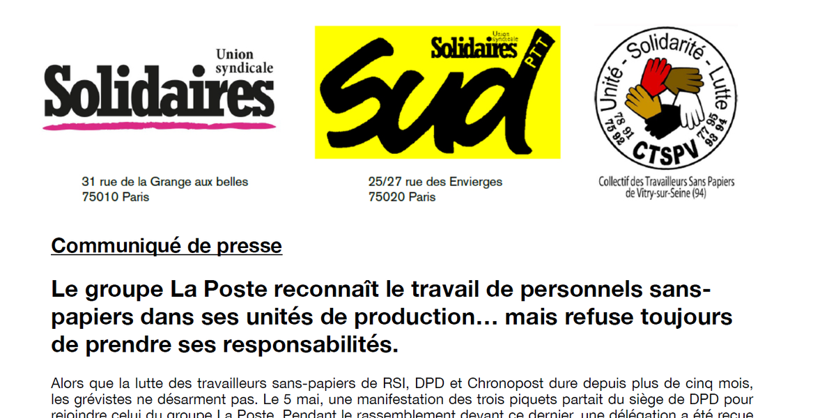 Alors que la lutte des travailleurs sans-papiers de RSI, DPD et Chronopost dure depuis plus de cinq mois, les grévistes ne désarment pas. Le 5 mai, une manifestation des trois piquets partait du siège de DPD pour rejoindre celui du groupe La Poste. Pendant le rassemblement devant ce dernier, une délégation a été reçue par un représentant de la direction des relations sociales de La Poste et, fait nouveau, par la DRH de Géopost, holding du groupe qui chapeaute DPD et Chronopost.