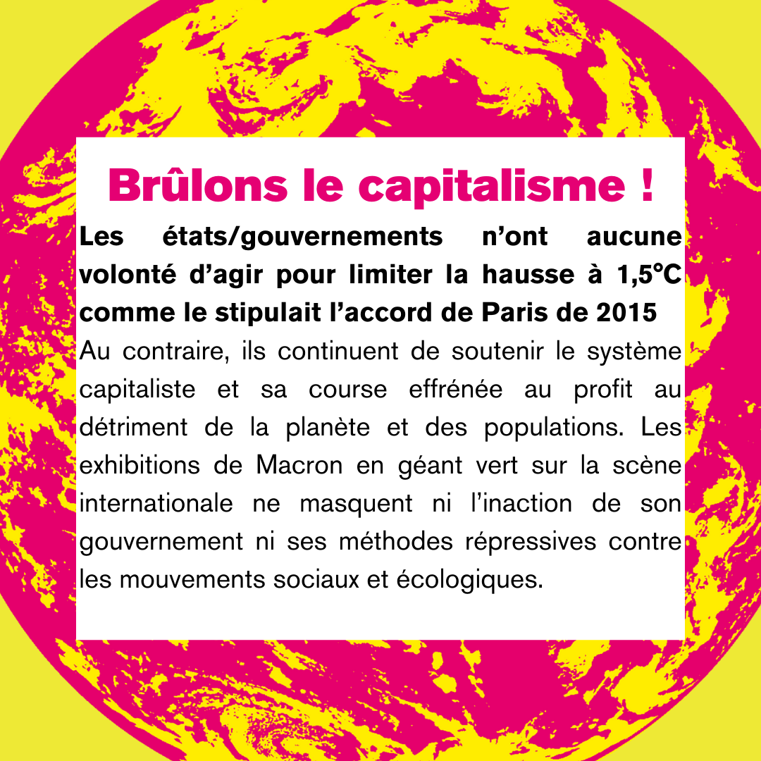 Au contraire, ils continuent de soutenir le système capitaliste et sa course effrénée au profit au détriment de la planète et des populations. Les exhibitions de Macron en géant vert sur la scène internationale ne masquent ni l’inaction de son gouvernement ni ses méthodes répressives contre les mouvements sociaux et écologiques.