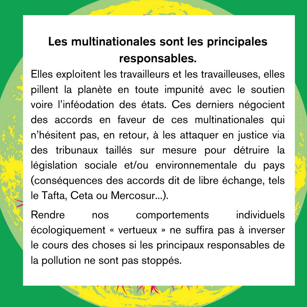 Elles exploitent les travailleurs et les travailleuses, elles pillent la planète en toute impunité avec le soutien voire l’inféodation des états. Ces derniers négocient des accords en faveur de ces multinationales qui n’hésitent pas, en retour, à les attaquer en justice via des tribunaux taillés sur mesure pour détruire la législation sociale et/ou environnementale du pays (conséquences des accords dit de libre échange, tels le Tafta, Ceta ou Mercosur...).