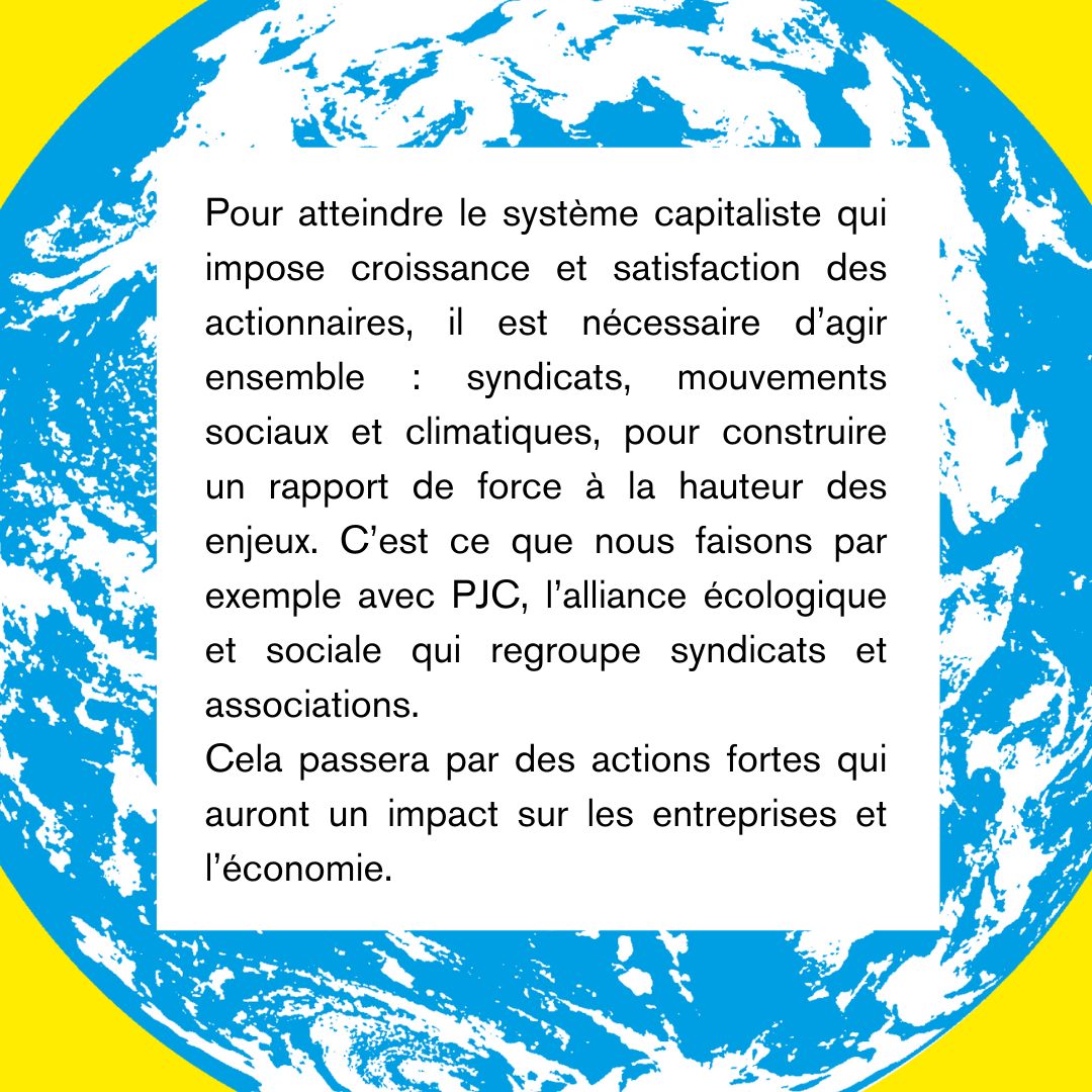 Pour atteindre le système capitaliste qui impose croissance et satisfaction des actionnaires, il est nécessaire d’agir ensemble : syndicats, mouvements sociaux et climatiques, pour construire un rapport de force à la hauteur des enjeux. C’est ce que nous faisons par exemple avec PJC, l’alliance écologique et sociale qui regroupe syndicats et associations.