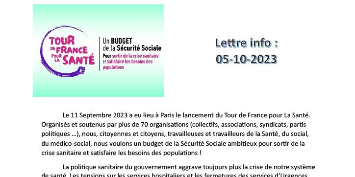 En pièce jointe la lettre d'info de notre Tour de France pour la Santé. A l'occasion du prochain vote du PLFSS, plus de 70 organisations (dont Solidaires et SUD Santé Sociaux) ont lancé un appel à organiser partout où cela est possible des initiatives pour dénoncer la situation de nos secteurs de la Santé, du Social, du Médico-Social.