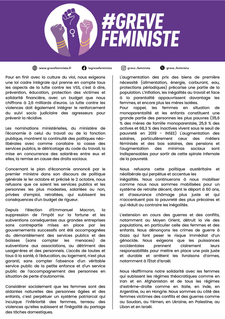 Le collectif Grève Féministe réunit associations féministes et généralistes de lutte pour les droits et organisations syndicales et politiques. Elles dénoncent la mise en place de ce gouvernement réactionnaire, autoritaire et libéral, qui fait des propositions directement inspirées de l’extrême droite, à l’opposé du résultat des élections législatives qui ont placé en tête la coalition du Nouveau Front Populaire, sans donner de fait une quelconque majorité même relative aux organisations et courants politiques représentés dans le nouveau gouvernement Barnier de septembre 2024.