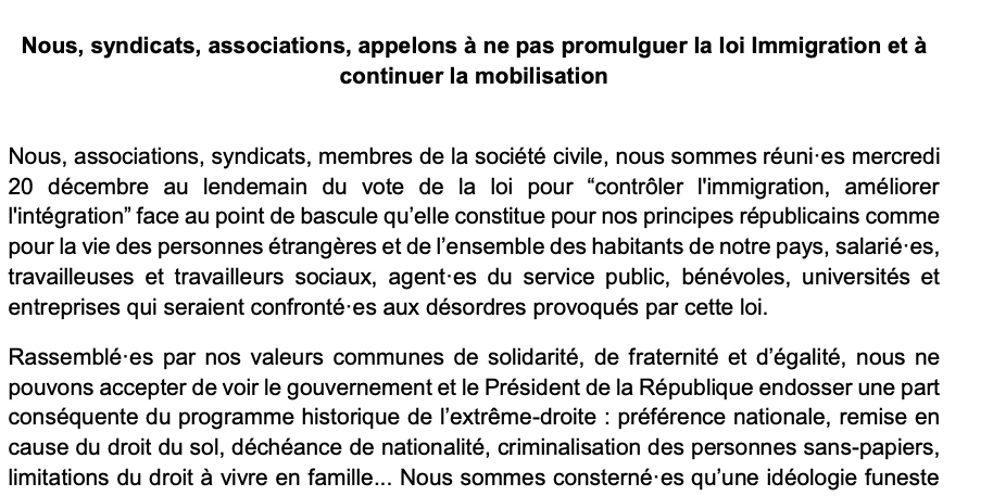 Nous, associations, syndicats, membres de la société civile, nous sommes réuni·es mercredi 20 décembre au lendemain du vote de la loi pour “contrôler l'immigration, améliorer l'intégration” face au point de bascule qu’elle constitue pour nos principes républicains comme pour la vie des personnes étrangères et de l’ensemble des habitants de notre pays, salarié·es, travailleuses et travailleurs sociaux, agent·es du service public, bénévoles, universités et entreprises qui seraient confronté·es aux désordres provoqués par cette loi.