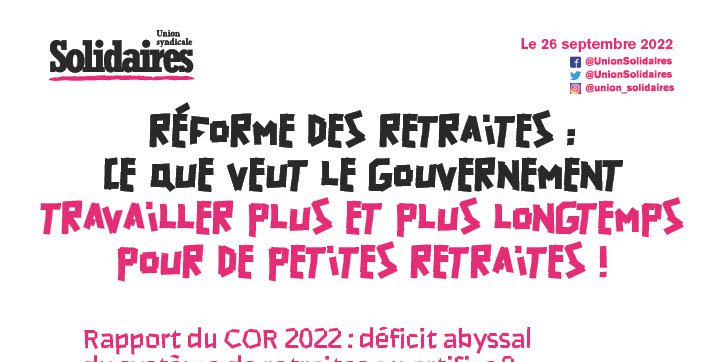 - Tout le monde n’a pas d’emploi jusque 65 ans, seulement 33% de la tranche 60-64 ans, soit l’un des plus bas taux de l’OCDE. Dès lors, les cotisations sociales ne rentreront pas davantage dans les caisses. Et cela alourdira la facture du chômage et servir de prétexte à de nouvelles réformes… Pour Solidaires il faut mener une politique de l’emploi déterminée et partager le travail : semaine à 32h sans perte de salaires, ni flexibilité. Cela diminuera fortement le chômage et améliorera les rentrées de cotisations sociales.