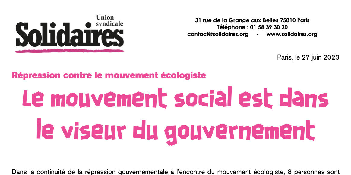 Effectivement, depuis des années tout l’arsenal répressif est utilisé par le gouvernement particulièrement contre des militant·es écologistes : matériel militaire d’écoute installé devant le domicile d’un militant, balise GPS posée sous le véhicule d’un militant, intimidation par les pro-bassines, condamnation de plusieurs militants allant jusqu'à des incarcérations et très récemment la dissolution du collectif des Soulèvement de la Terre. L’Union syndicale Solidaires dénonce avec force ces attaques permanentes envers les différents collectifs de défense de la nature et de l’eau, en lieu et place d’une véritable politique d’urgence pour le climat.