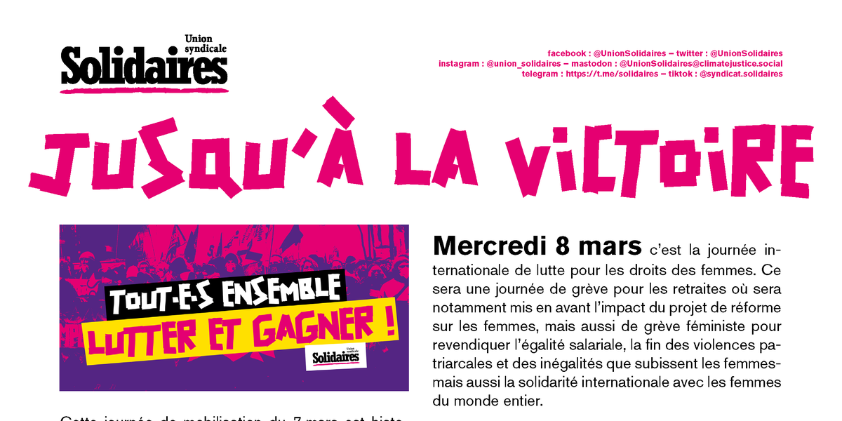 c’est la journée internationale de lutte pour les droits des femmes. Ce sera une journée de grève pour les retraites où sera notamment mis en avant l’impact du projet de réforme sur les femmes, mais aussi de grève féministe pour revendiquer l’égalité salariale, la fin des violences patriarcales et des inégalités que subissent les femmes mais aussi la solidarité internationale avec les femmes du monde entier.