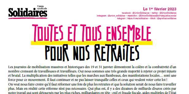 Ces deux dates doivent permettre au maximum de personnes de pouvoir participer à la mobilisation. Pour Solidaires, elles doivent aussi servir de point d’appui pour les secteurs qui essaient d’accélérer la mobilisation. Nous le savons, pour gagner il faut encore monter le niveau de rapport de force. Cela veut dire discuter en assemblée générale de la possibilité de reconduire la grève : le blocage généralisé de l’économie est notre force.