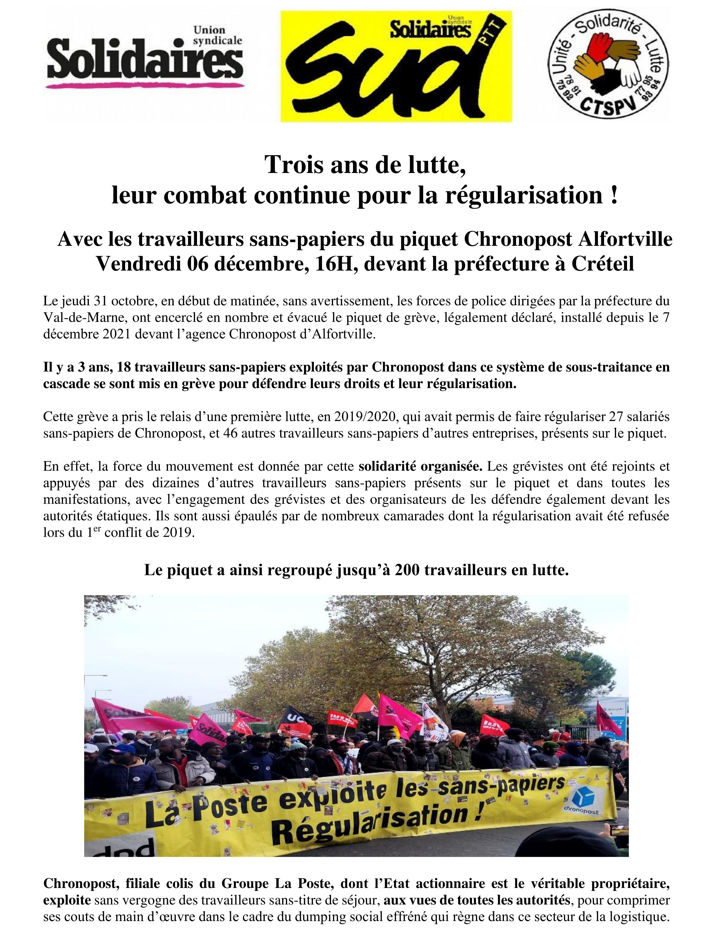 Travailleurs Sans Papiers de Chronopost : 3 ans de lutte, le combat continue pour la régularisation ! rassemblement le 6 décembre à16H