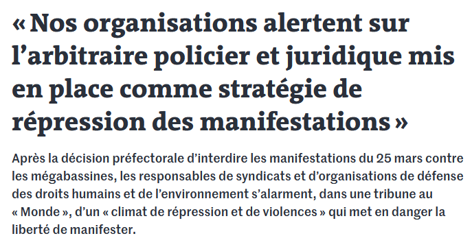 Tribune collective publiée dans le journal Le Monde le 24 mars 2023 : https://www.lemonde.fr/idees/article/2023/03/24/nos-organisations-alertent-sur-l-arbitraire-policier-et-juridique-mis-en-place-comme-strategie-de-repression-des-manifestations_6166792_3232.html