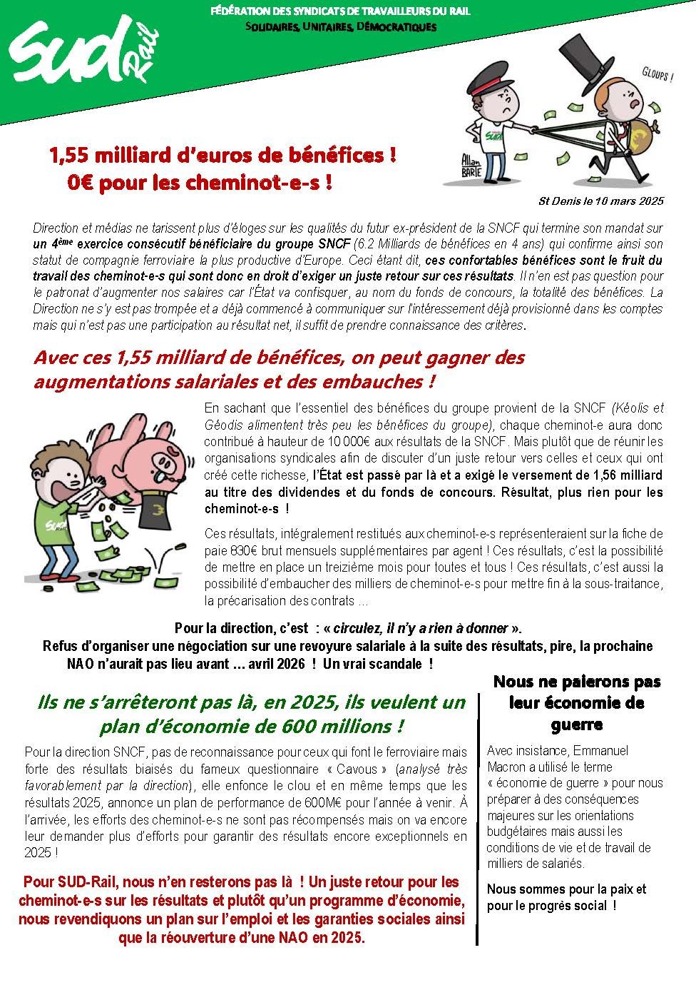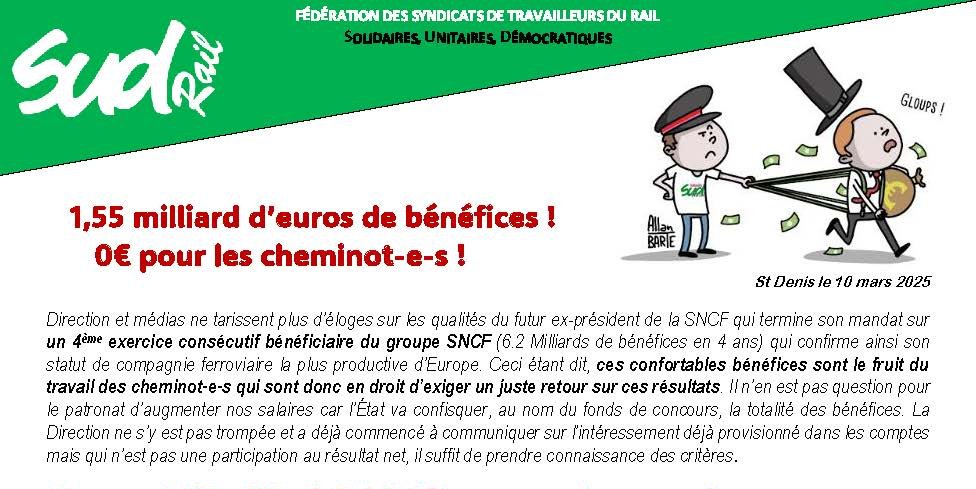 Pour SUD-Rail, nous n’en resterons pas là ! Un juste retour pour les cheminot-e-s sur les résultats et plutôt qu’un programme d’économie, nous revendiquons un plan sur l’emploi et les garanties sociales ainsi que la réouverture d’une NAO en 2025.