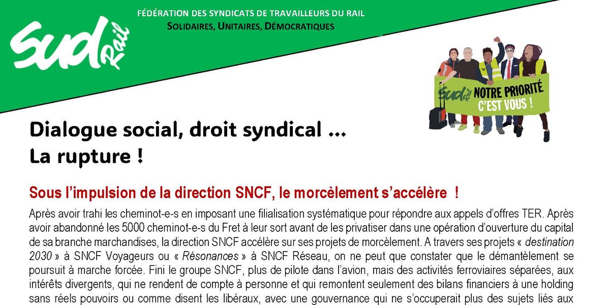 Cette décision signifie, qu’en dehors des démarches liées à notre initiative et à des préavis de grève, SUD-Rail ne participera plus à l’ensemble des instances représentatives, aux réunions organisées par la direction et décide durcir les contacts avec la direction.