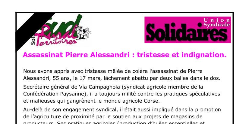 Nous avons appris avec tristesse mêlée de colère l’assassinat de Pierre Alessandri, 55 ans, le 17 mars, lâchement abattu par deux balles dans le dos.