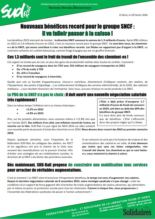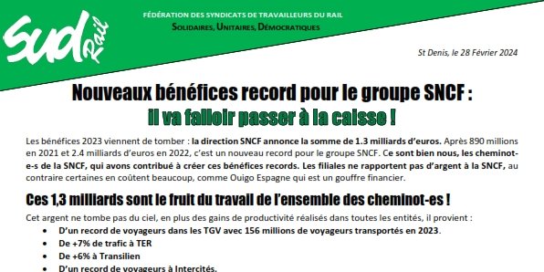 Les bénéfices 2023 viennent de tomber : la direction SNCF annonce la somme de 1.3 milliards d’euros. Après 890 millions en 2021 et 2.4 milliards d’euros en 2022, c’est un nouveau record pour le groupe SNCF. Ce sont bien nous, les cheminot e-s de la SNCF, qui avons contribué à créer ces bénéfices record.