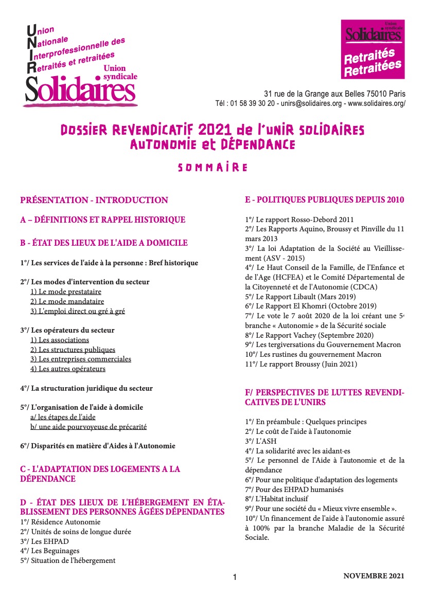 La question de la perte d'autonomie des personnes âgées concerne tout le monde, et pas seulement les personnes âgées fragilisées. La perte d'autonomie est l'un des domaines où la solidarité nationale devrait trouver le mieux à s'exprimer. Ce dossier comprend l’état des lieux, les politiques depuis 2010 et nos perspectives de luttes revendicatives.