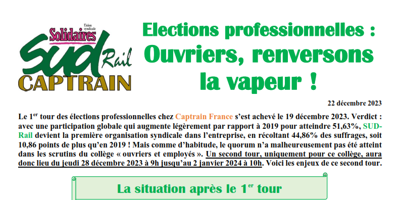 Le 1er tour des élections professionnelles chez Captrain France (filiale privée de la SNCF) s’est achevé le 19 décembre 2023.
