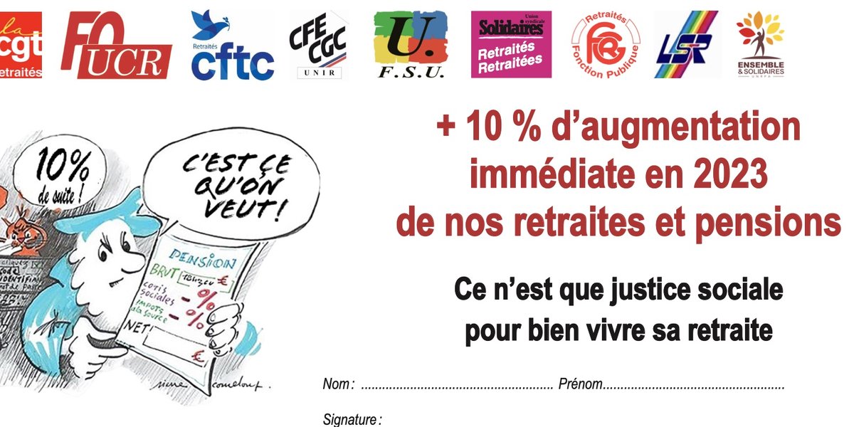 Un tract accompagne cette pétition afin d’expliciter nos revendications en matière de niveau des pensions : il faut une augmentation immédiate, chiffrée cette fois en pourcentage (10 %), même si un chiffrage par un montant identique pour toutes et tous aurait été plus égalitaire (par exemple, 200 euros tout de suite, pour tout le monde). En tout état de cause, cette exigence d’une augmentation « immédiate » veut répondre à l’urgence face aux décalages constatés depuis 2014 entre l’évolution des pensions et l’évolution des salaires et des prix (dans un contexte de forte inflation), sachant que nous demandons aussi qu’aucune pension à taux plein ne soit inférieure au SMIC, ce qui conduirait à une augmentation plus importante des basses pensions.