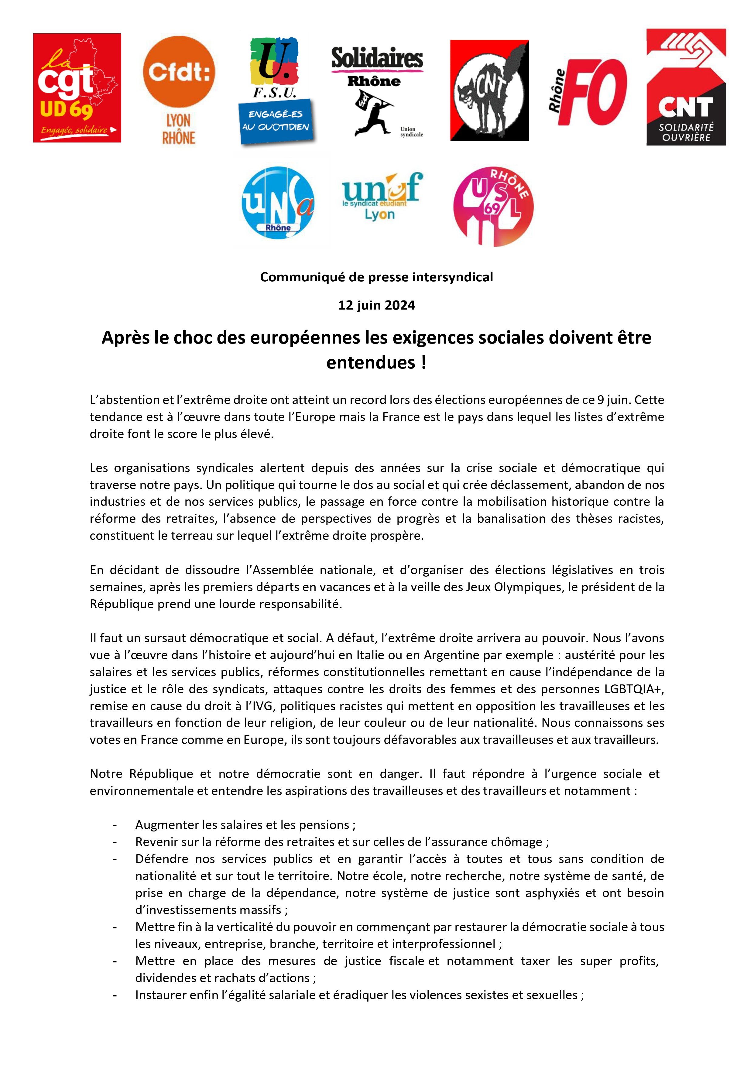 Communiqué de presse intersyndical 12 juin 2024 - Après le choc des européennes : les exigences sociales doivent être entendues !