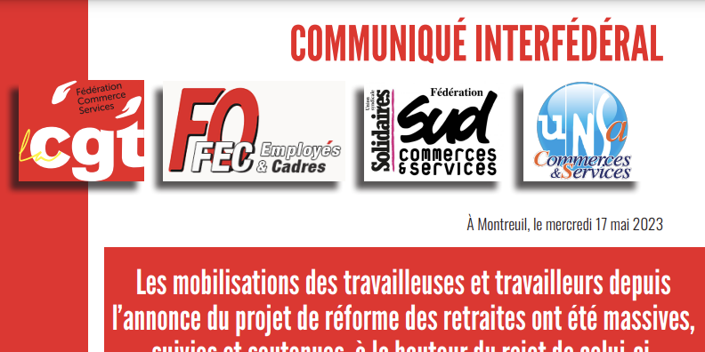 L’intersyndicale appelle l’ensemble des travailleuses et travailleurs des secteurs du commerce et des services à multiplier les initiatives dans les entreprises, à appeler à la grève jusqu’au blocage. Nous devons impacter sévèrement les profits du patronat complice du gouvernement pour exiger de Macron l’abrogation pure et simple de la loi retraite mais également pour exiger de réelles augmentations de salaires.