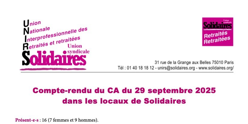 - A.G. du 10 décembre 2025, avec le débat sur le financement de la Sécu. Décision pour le calendrier de préparation, qui pourrait être : envoi de la motion le 13 octobre - limite pour les amendements le 3 novembre ; décision quant aux amendements à discuter lors de l'AG, au CA du 13 novembre.