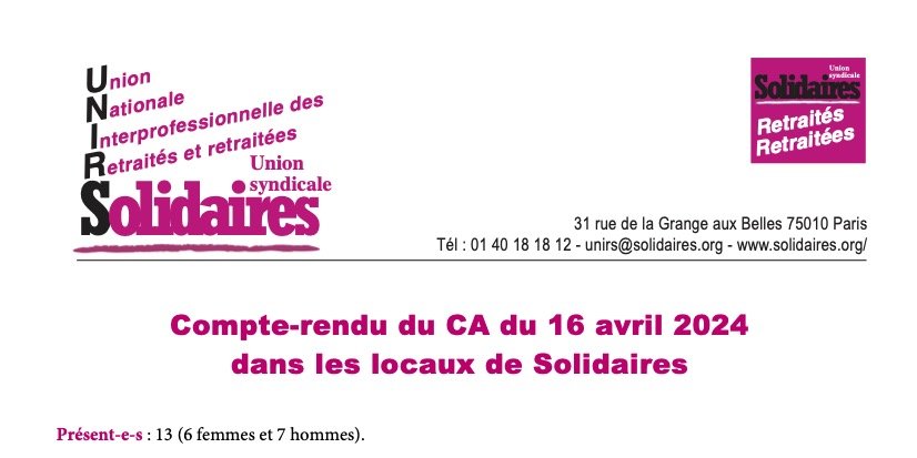 Voici l'ordre du jour de cette réunion de CA et, en annexe, l'état des cotisations 2023 et 2024, ainsi que notre compte-rendu de la rencontre avec le conseil fédéral de SUD Santé sociaux au sujet du droit de vote de l'Unirs dans les instances de Solidaires.