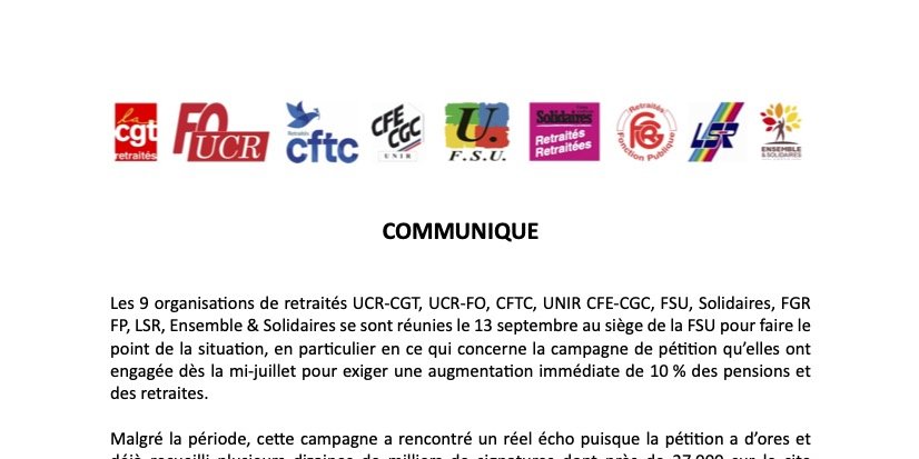 - Une conférence de presse le mardi 17 octobre à 11 h 30 dans les locaux de la CGT fera connaître la journée d’action et la carte pétition exigeant 10 % d’augmentation immédiate des pensions. La CGT envoie l’invitation.