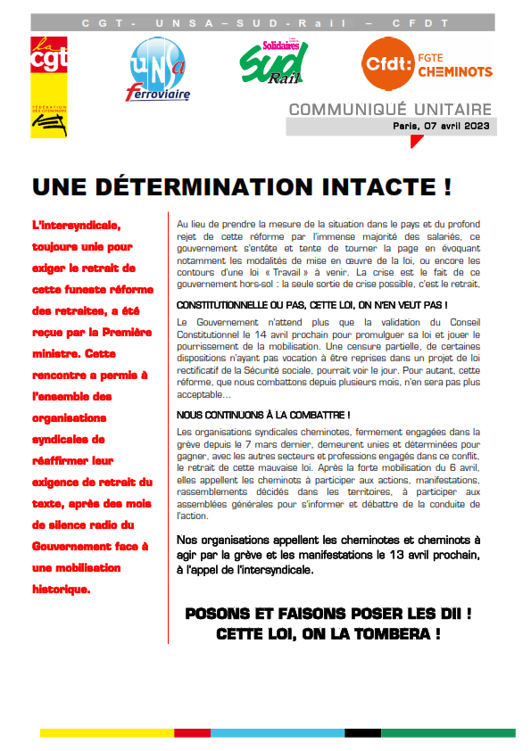 Nos organisations appellent les cheminotes et cheminots à agir par la grève et les manifestations le 13 avril prochain, à l’appel de l’intersyndicale.