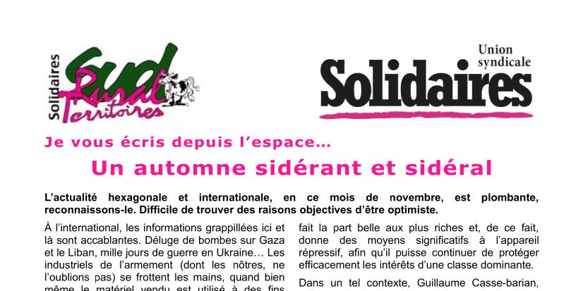 Sinon, il nous reste une option, moins onéreuse finalement, celle de faire grève et rejoindre les cortèges, le 5 décembre 2024, de celles et ceux qui rappelleront à nos monarques, sinistres et petits cadres obséquieux en quête de faveurs et d’avancement, qu’on ne lâche pas l’affaire ! Il ne tient qu’à nous, collectivement et massivement, de renverser la vapeur et de construire un autre rapport de force.