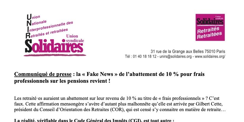 Voici le communiqué des retraité·es Solidaires, au sujet de la « Fake News » de la soi-disant déduction de 10 % du revenu pour « frais professionnels » des retraité·es.