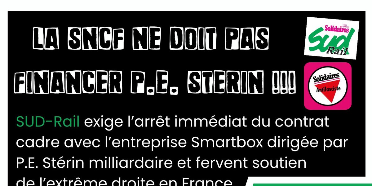 Nous avons appris récemment, à l’occasion d’un mail « adressé à l’ensemble des collaborateurs de l’établissement ESV TGV OUEST de la région Bretagne » que l'entreprise SNCF allait proposer des "Smartbox" lors d'un concours organisé par le groupe RIALTO. Vous n’êtes pas sans savoir que l’entreprise Smartbox a fait la fortune du milliardaire Pierre-Édouard Stérin ; nous refusons que les richesses produites par les cheminotes et cheminots financent ce milliardaire d'extrême-droite.