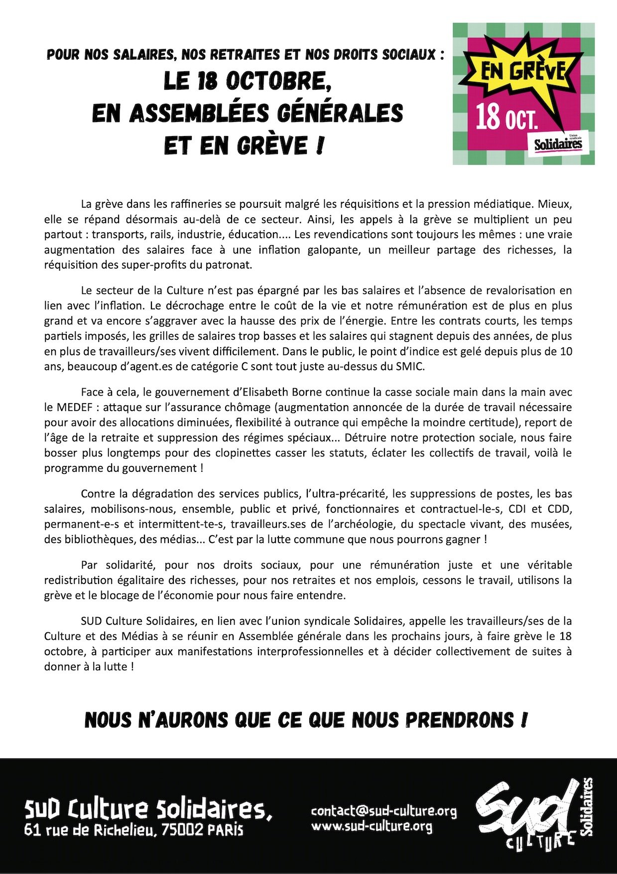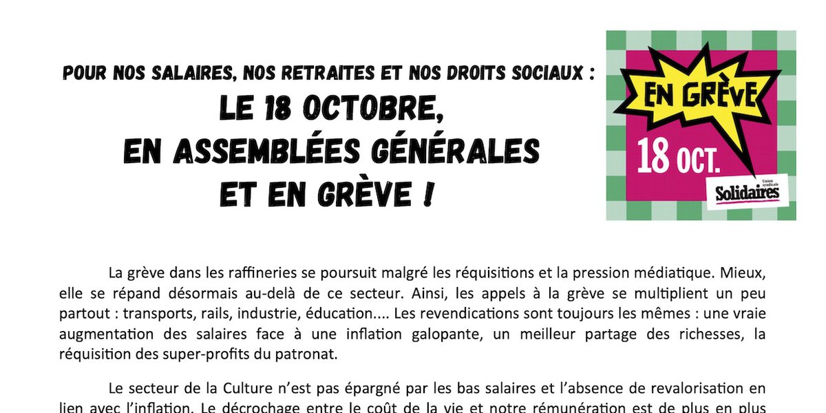 SUD Culture Solidaires, en lien avec l’union syndicale Solidaires, appelle les travailleurs/ses de la Culture et des Médias à se réunir en Assemblée générale dans les prochains jours, à faire grève le 18 octobre, à partciper aux manifestatons interprofessionnelles et à décider collectvement de suites à donner à la lute !