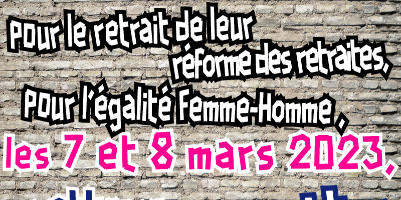 • reconduisons le 8 mars, pour dénoncer la situation faite aux femmes en termes de pensions, mais aussi les inégalités salariales, les violences sexistes et sexuelles, le patriarcat (…),