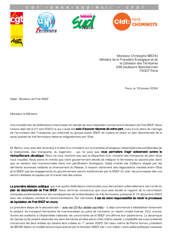 Comme nous l'avions déjà fait le 27 avril 2023, les fédérations cheminotes CGT - UNSA Ferroviaire - SUD-Rail - CFDT  ont décidé de vous ré interpeller concernant la situation de Fret SNCF. Vous avez été reconduit à la tête d’un ministère sur la transition écologique rassemblant les portefeuilles de la biodiversité, des transports, du logement … qui ne peut que vous permettre d’agir activement contre le réchauffement climatique ; dans ce cadre, nous vous demandons officiellement de vous rencontrer dans les meilleurs délais.