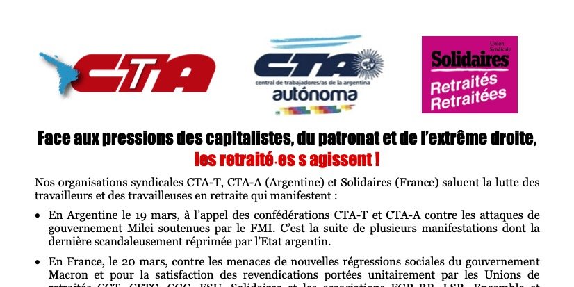 Nos organisations syndicales CTA-T, CTA-A (Argentine) et Solidaires (France) saluent la lutte des travailleurs et des travailleuses en retraite qui manifestent :