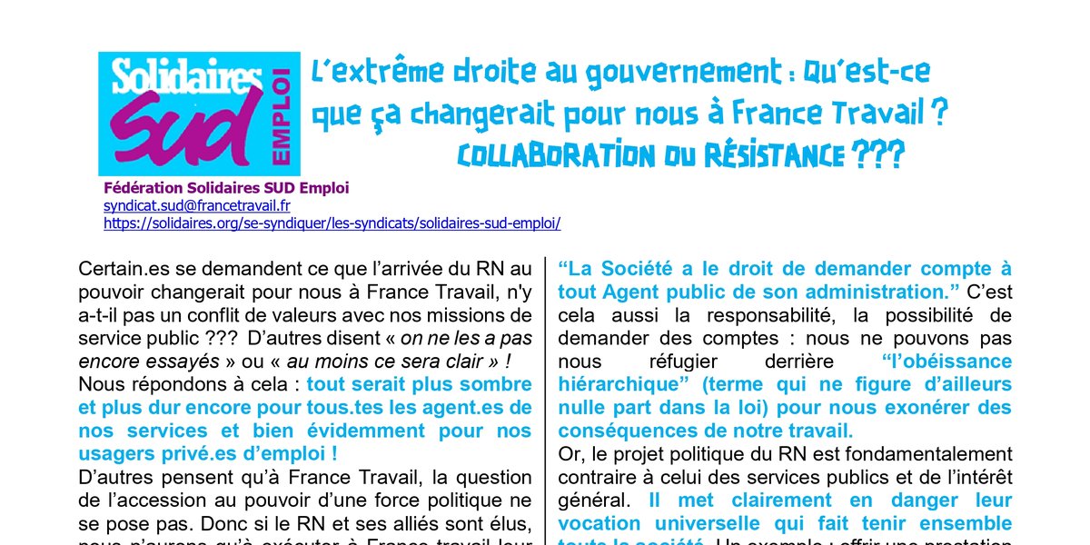 Certain.es se demandent ce que l’arrivée du RN au pouvoir changerait pour nous à France Travail, n'y a-t-il pas un conflit de valeurs avec nos missions de service public ??? D’autres disent « on ne les a pas encore essayés » ou « au moins ce sera clair » !