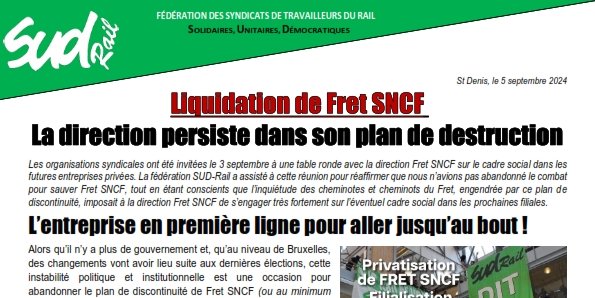 Alors qu’il n’y a plus de gouvernement et, qu’au niveau de Bruxelles, des changements vont avoir lieu suite aux dernières élections, cette instabilité politique et institutionnelle est une occasion pour abandonner le plan de discontinuité de Fret SNCF (ou au minimum décider d’un moratoire). C’est ce que la délégation SUD-Rail a défendu et continuera de le faire avec un nouveau rassemblement unitaire le 26 septembre devant le Ministère des Transports.