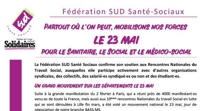 La Fédération SUD Santé Sociaux confirme son soutien aux Rencontres Nationales du Travail Social, auxquelles elle participe activement avec d’autres organisations syndicales, des collectifs, des salarié·es syndiqué·es ou non et des étudiant·es.