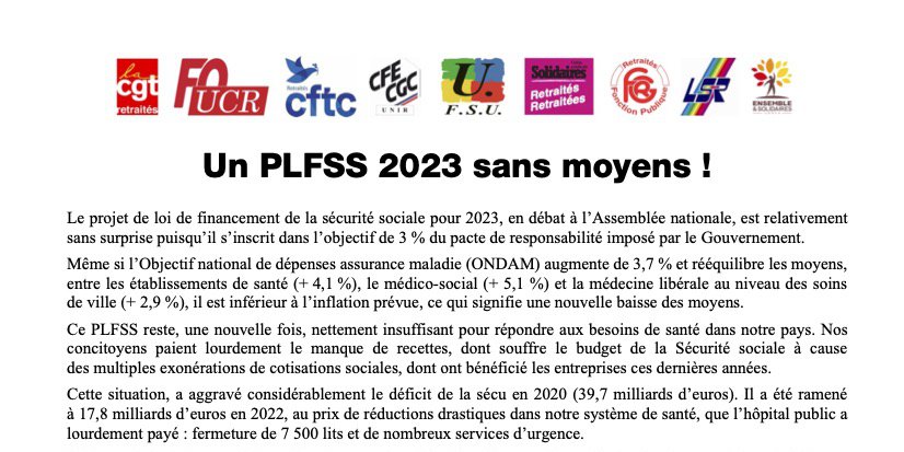 Nous appelons, sur l’ensemble du territoire dans la semaine du 7 au 12 novembre, nos organisations à interpeller unitairement les Députés, Sénateurs et Préfets, pour exiger des moyens supplémentaires au niveau du PLFSS 2023. Nous réaffirmons également, notre opposition à toute réforme des retraites qui imposerait un recul de l’âge de départ (ou une augmentation de la durée de cotisations) et une baisse du niveau des pensions.