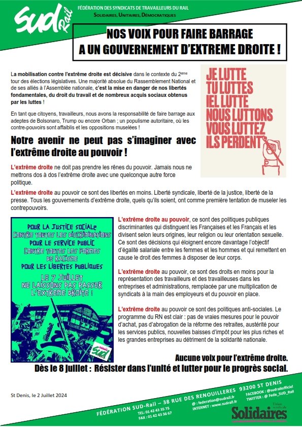 La mobilisation contre l’extrême droite est décisive dans le contexte du 2ème tour des élections législatives. Une majorité absolue du Rassemblement National et de ses alliés à l’Assemblée nationale, c’est la mise en danger de nos libertés fondamentales, du droit du travail et de nombreux acquis sociaux obtenus par les luttes !