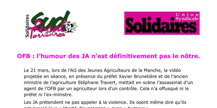 Le 21 mars, lors de l’AG des Jeunes Agriculteurs de la Manche, la vidéo projetée en séance, en présence du préfet Xavier Brunetière et de l’ancien ministre de l’agriculture Stéphane Travert, mettait en scène l’assassinat d’un agent de l’OFB par un agriculteur lors d’un contrôle. Cela n’a offusqué ni le préfet ni l’ex-ministre.