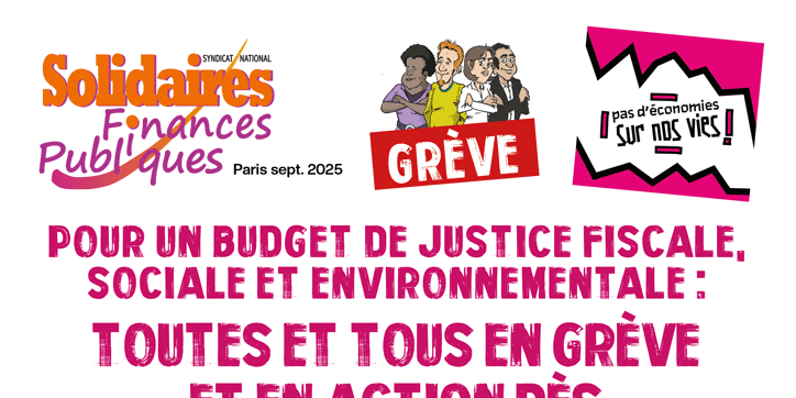Depuis les annonces du 15 juillet, une vague d’indignation et de colère s’est développée dans tous les secteurs professionnels et parmi une grande partie de la population. Cette colère prend différentes formes au fil des jours et bouscule jusqu’au plus haut niveau de l’État. Depuis cet été, la date du 10 septembre s’est inscrite dans le paysage. Solidaires Finances Publiques appelle, dès ce jour là, à se mettre en grève et à participer à l’ensemble des actions qui auront lieu sur le territoire. C’est pour les agentes et agents des Finances Publiques l’occasion de rappeler que de l’argent, il y en a - et aux Finances, on le sait ! Le 10 est une première étape essentielle pour exprimer notre colère face aux politiques budgétaires qui appauvrissent le plus grand nombre et détruisent les services publics. Elle ne s’arrêtera pas là : d’ores et déjà, avec ou sans Bayrou, l’intersyndicale interprofessionnelle appelle à une nouvelle journée de grève le 18 septembre. En attendant, montrons dès le 10 septembre notre détermination à imposer nos revendications.