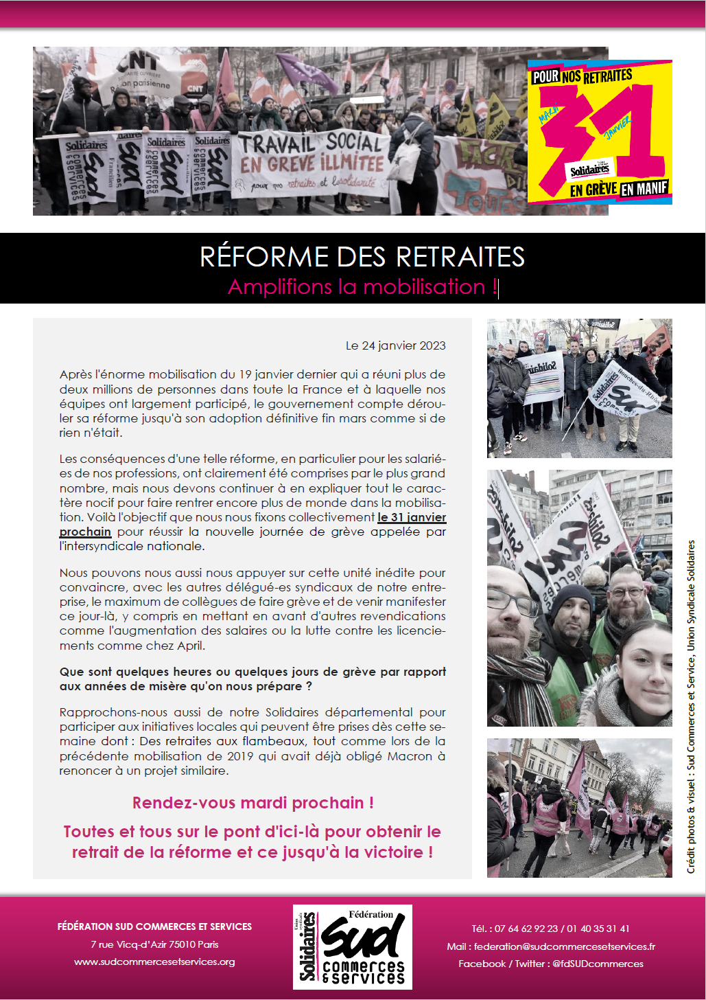 Les conséquences d'une telle réforme, en particulier pour les salarié-es de nos professions, ont clairement été comprises par le plus grand nombre, mais nous devons continuer à en expliquer tout le caractère nocif pour faire rentrer encore plus de monde dans la mobilisation. Voilà l'objectif que nous nous fixons collectivement le 31 janvier prochain pour réussir la nouvelle journée de grève appelée par l'intersyndicale nationale.