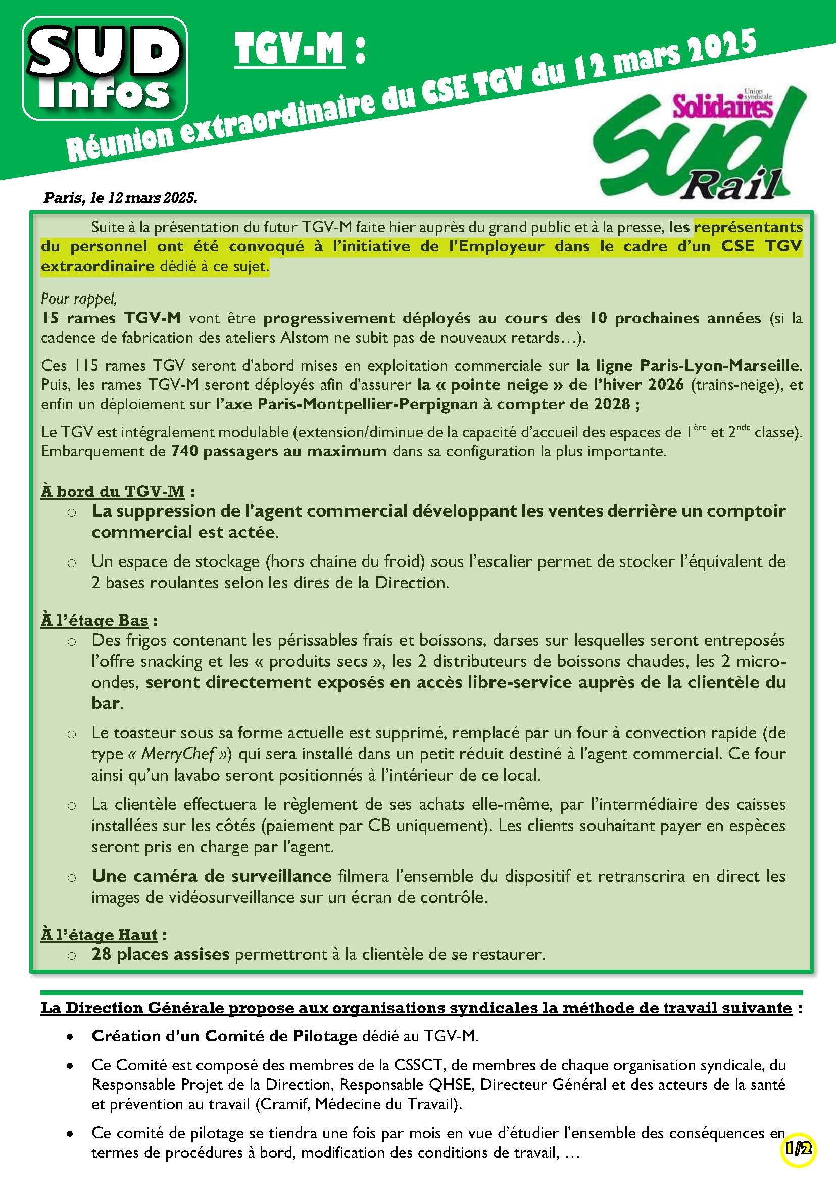 Suite à la présentation du futur TGV-M, faitele 11 mars auprès du grand public et à la presse, les représentants du personnel ont été convoqués à l’initiative de l’Employeur dans le cadre d’un CSE TGV extraordinaire dédié à ce sujet.