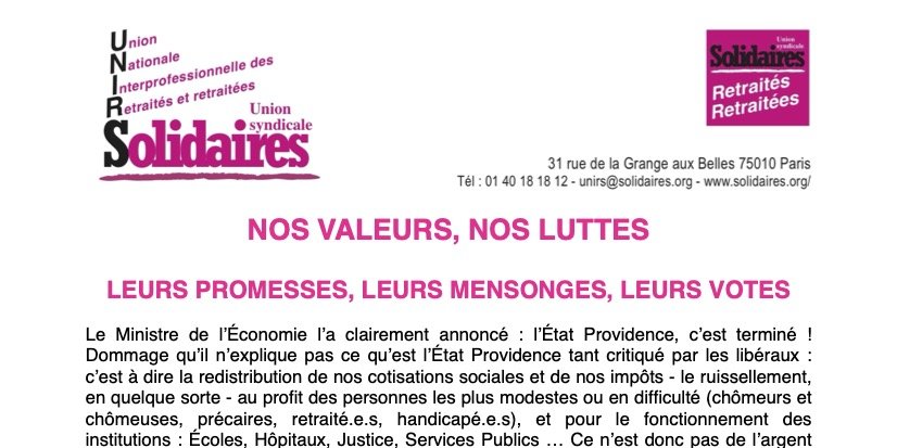 L’Union Nationale Interprofessionnelle des Retraité·e·s Solidaires, ce sont des syndicalistes qui, face aux multiples attaques dont les retraité·e·s sont l’objet, ont décidé de continuer la lutte syndicale afin d’améliorer les conditions de vie des retraité·e·s : montant minimum des pensions, augmentation des retraites, augmentation et élargissement des minima sociaux, développement des services d’aide à la personne, lutte contre l’explosion des restes à charge et dépassements d’honoraires dans la santé, mesures contre la fracture numérique, facilitation de la mobilité … Nous avons des revendications progressistes, et des propositions qui peuvent permettre d’y accéder : réforme des impôts, pour une fiscalité progressive, suppression des exonérations de cotisations non justifiées aux entreprises, instauration de cotisations sociales sur tous les revenus créés par le travail (salaires, dividendes, actions), lutte contre la fraude fiscale…
