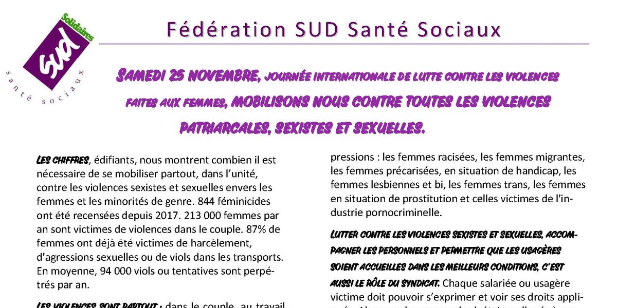 Sur nos lieux de travail, nous les côtoyons doublement. En tant que victimes puisque nous y constatons plus de 20 viols ou tentatives par jour, et où 20% de femmes salariées sont victimes de harcèlement sexuel, 25% du total étant des agressions sexuelles. Ces faits sont majoritairement commis par des hommes, le plus souvent des collègues et des usagers. Nous les côtoyons également en tant que salariées des établissements de la santé, du social et du médicosocial, puisque nous y accompagnons celles qui sont les plus touchées par ces violences, celles qui souffrent déjà de multiples oppressions : les femmes racisées, les femmes migrantes, les femmes précarisées, en situation de handicap, les femmes lesbiennes et bi, les femmes trans, les femmes en situation de prostitution et celles victimes de l'industrie pornocriminelle.