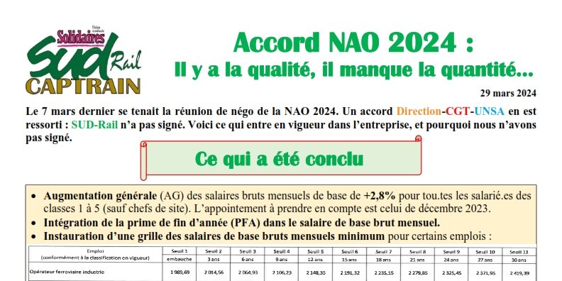 Le 7 mars dernier se tenait la réunion de négociation de la NAO 2024. Un accord Direction-CGT-UNSA en est ressorti : SUD-Rail n’a pas signé. Voici ce qui entre en vigueur dans l’entreprise, et pourquoi notre syndicat n'a pas signé cet accord.